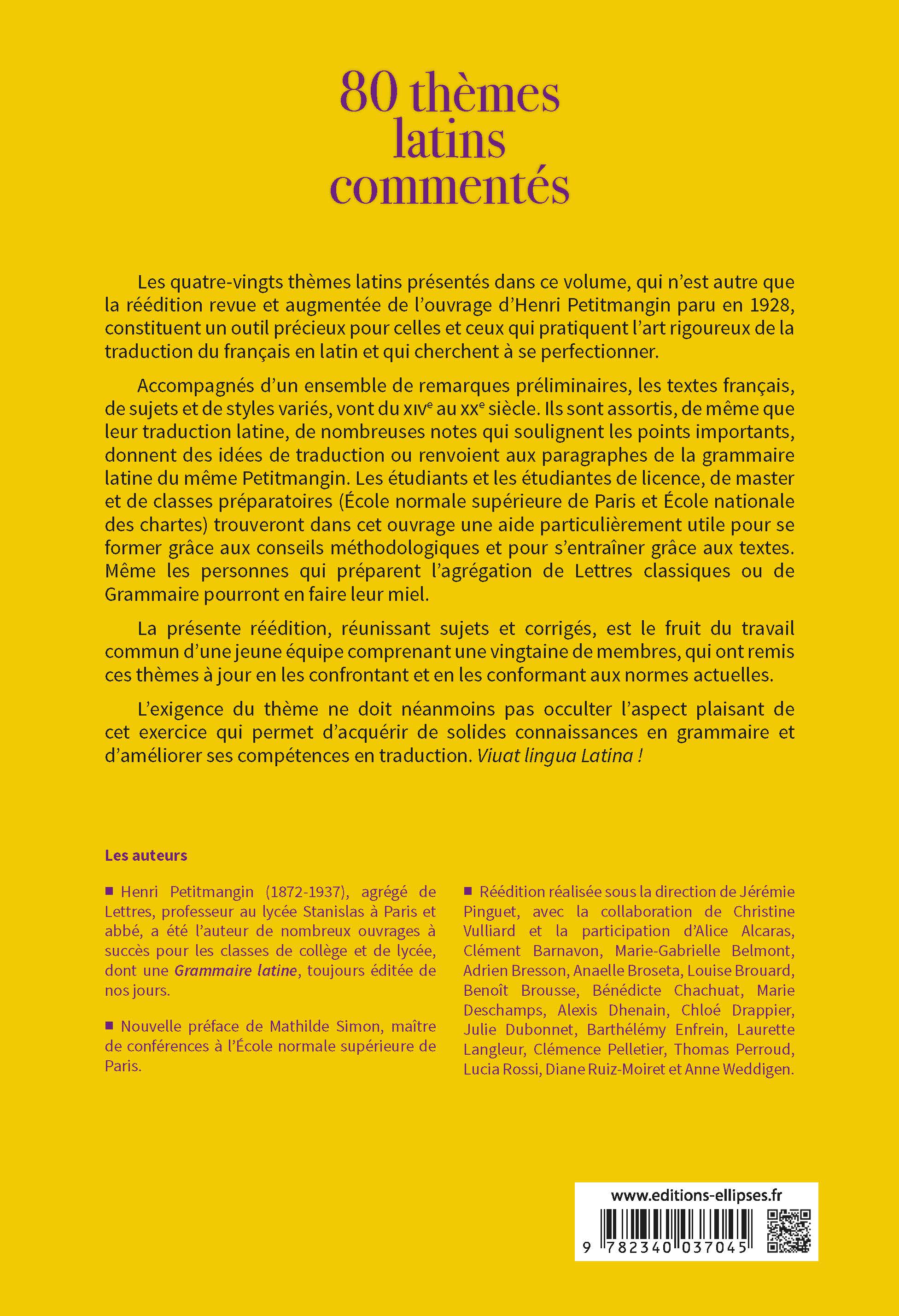 80 thèmes latins commentés. Henri Petitmangin, réédition collective. Paris, Ellipses, janvier 2020, 256 pages, 24 €. ISBN : 9782340037045. Disponible en version numérique : 18,99 €. ISBN : 9782340039834.