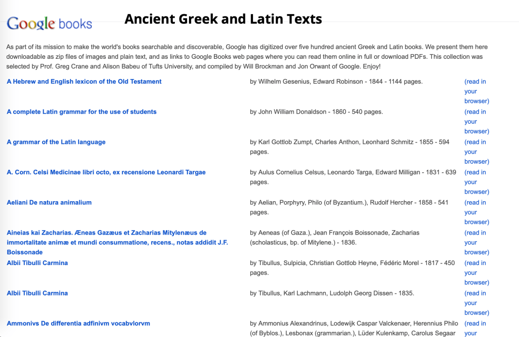 Google Books propose une longue liste d’ouvrages latins et grecs disponibles en ligne.