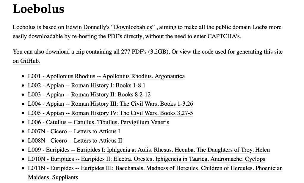 Le site Loebolus propose plusieurs dizaines d’éditions de la Loeb Classical Library (éditions langues anciennes – anglais) au format PDF. Ces œuvres sont éditées par la Harvard University Press.