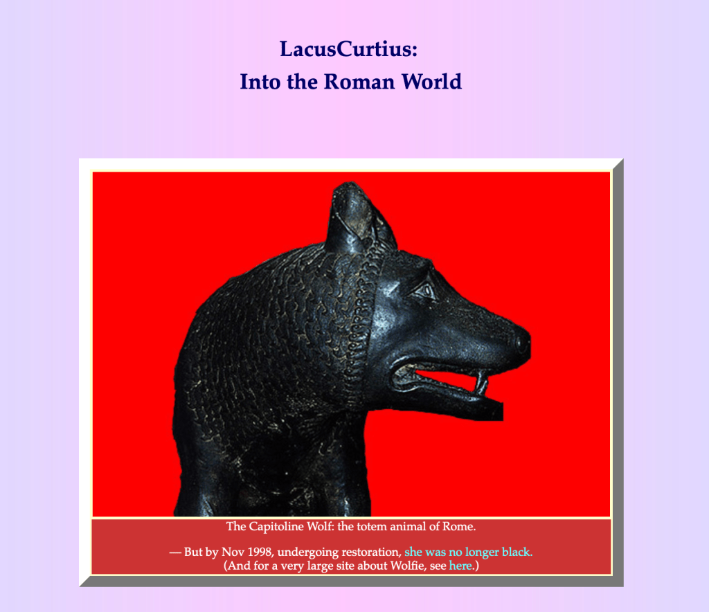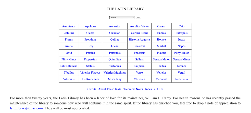 LacusCurtius met également à disposition nombre de textes, souvent en bilingue langue ancienne – anglais, des inscriptions latines, des dictionnaires de latin et d’autres ouvrages de littérature seconde.