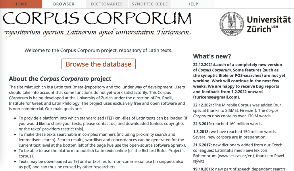 Corpus Corporum regroupe de très nombreux textes latins dans sa base de données : les textes sacrés (Bible et Coran) s’y trouvent, la patristique est à l’honneur avec des dizaines et des dizaines d’auteurs, l’Antiquité également avec tous les classiques, mais aussi la Renaissance (avec Pétrarque, Bruno) et la Neolatinitas (quelques auteurs comme Lipsius, Melanchthon). Les grammariens et bien d’autres catégories sont aussi représentés. Le site est géré par l’Universität Zürich.