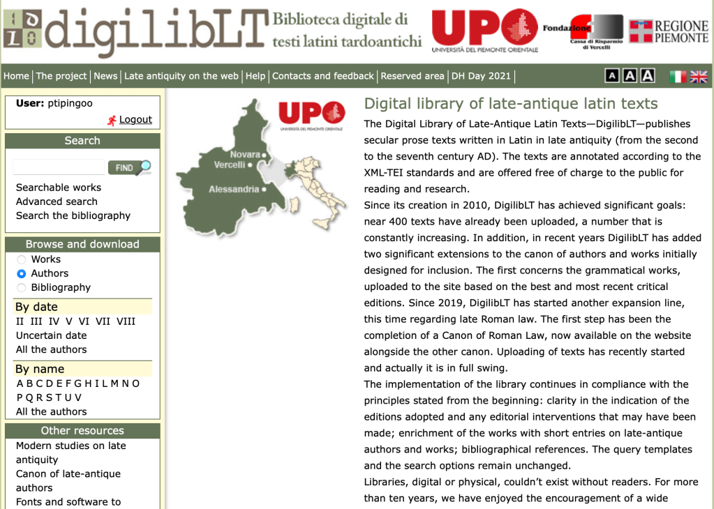DigitlibLT permet d’avoir accès à des textes latins tardo-antiques : on y trouve Scaurus, Festus, Florus, Ammien Marcellin, mais aussi le Codex Iustinianus, et tant d’autres. Le site est géré par l’Univiersità del Piemonte Orientale (UPO).