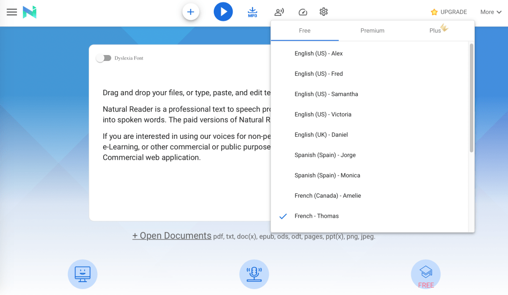 Natural Reader est un logiciel qui propose des voix gratuites, en anglais mais aussi en français, et il y a bien sûr une version Premium pour les intéressé·e·s : elle permet d’utiliser l’OCR pour des documents photographiés par exemple ou de transformer ce qui est lu en fichier mp3.
