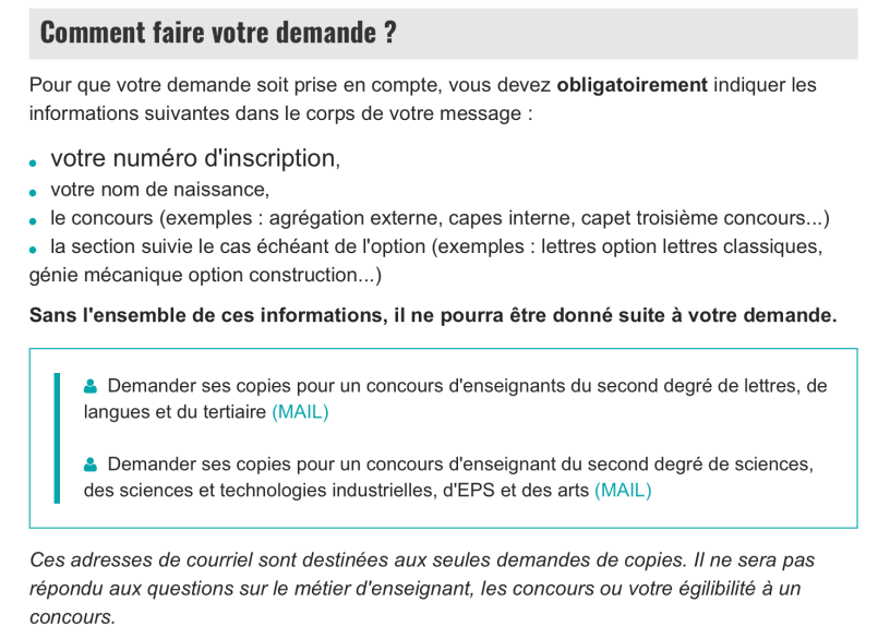 Pour demander vos copies de concours (CAPES, agrégations, etc.), vous trouverez toutes les indications sur ce site de l’Éducation nationale. Il suffit d’indiquer par mail les informations demandées.
