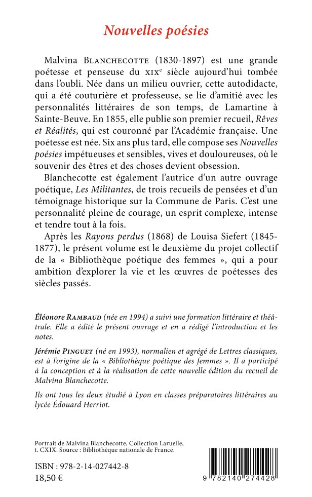 Malvina Blanchecotte (1830-1897) est une grande poétesse et penseuse du XIXe siècle aujourd’hui tombée dans l’oubli. Née dans un milieu ouvrier, cette autodidacte, qui a été couturière et professeuse, se lie d’amitié avec les personnalités littéraires de son temps, de Lamartine à Sainte-Beuve. En 1855, elle publie son premier recueil, Rêves et Réalités, qui est couronné par l’Académie française. Une poétesse est née. Six ans plus tard, elle compose ses Nouvelles poésies impétueuses et sensibles, vives et douloureuses, où le souvenir des êtres et des choses devient obsession.