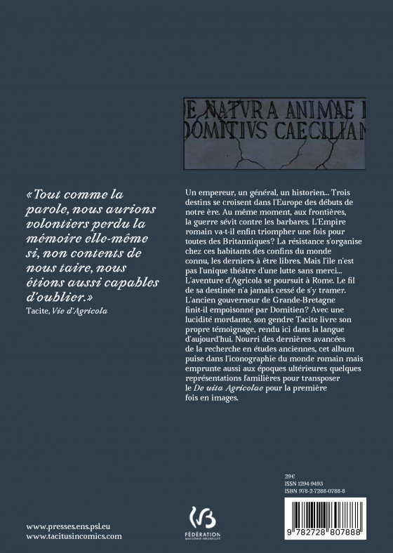 L’album proprement dit (90 pages) est complété d’un dossier qui comprend un guide alphabétique de l’univers de Tacite (40 pages) et le texte bilingue latin-français de l’Agricola (texte Woodman de Cambridge et traduction nouvelle).